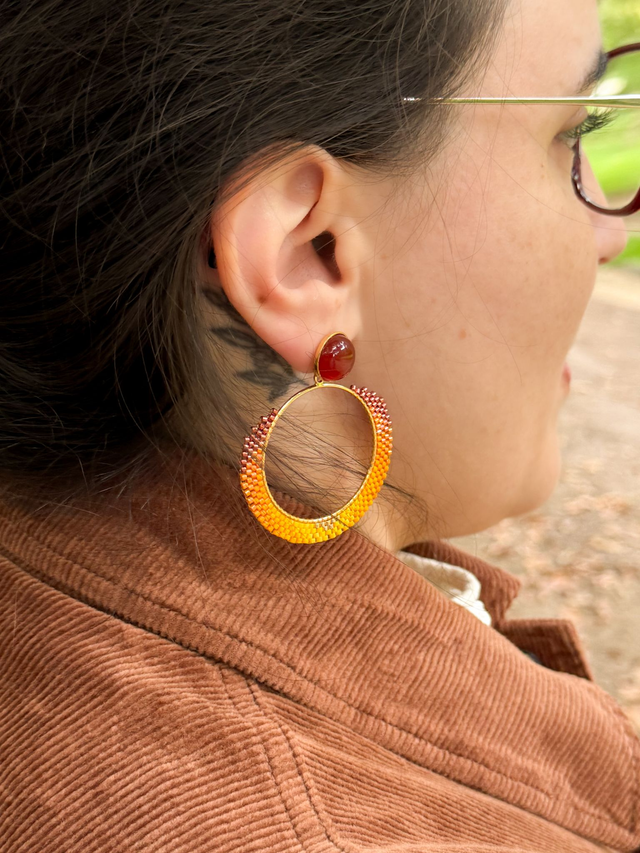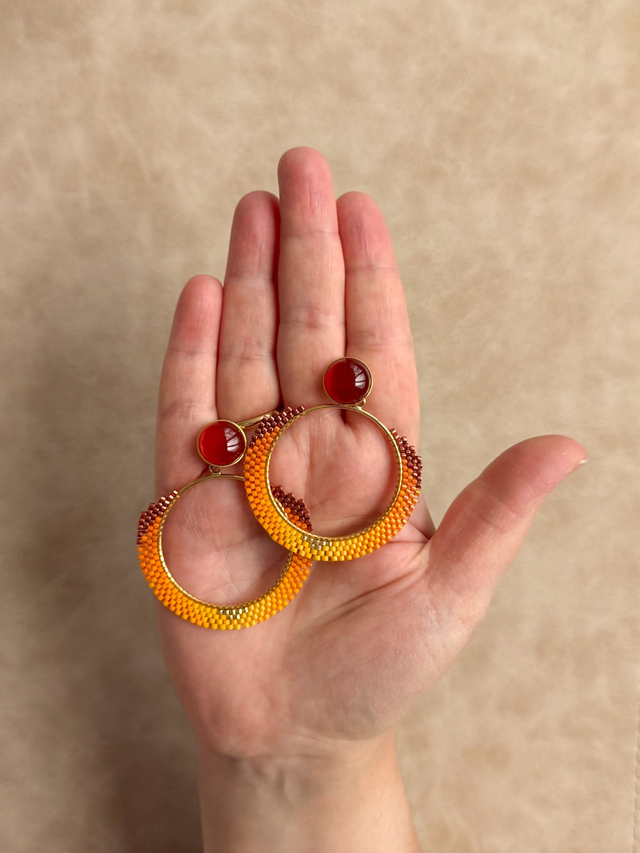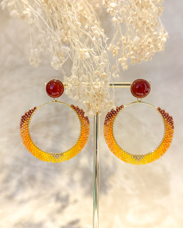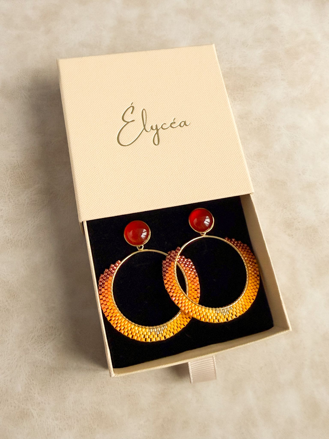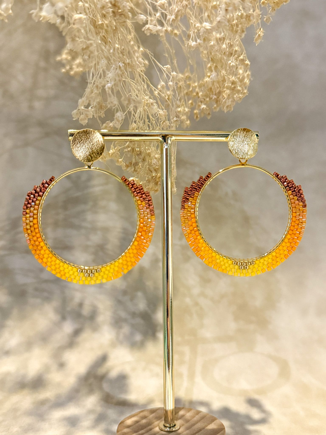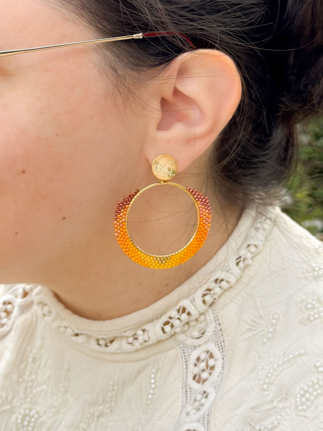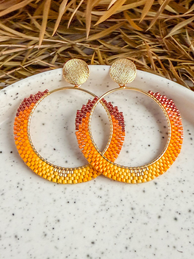 Un dégradé harmonieux de perles Miyuki japonaises dévoile ses nuances automnales, du orange cuivré au jaune doré. Deux heures de tissage brickstitch traditionnel donnent naissance à ces créoles pensées pour accompagner vos métamorphoses.