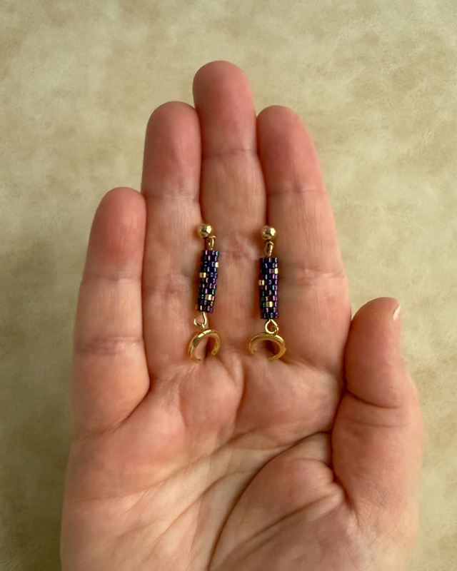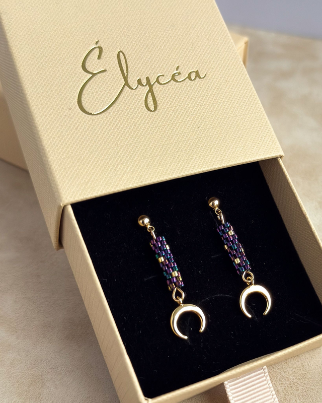 J'ai observé la lune et le ciel nocturne. Ces boucles capturent la magie des nuits étoilées avec leurs reflets irisés changeants et leur croissant doré. Une heure de tissage perle par perle pour ce bijou délicat et lumineux.