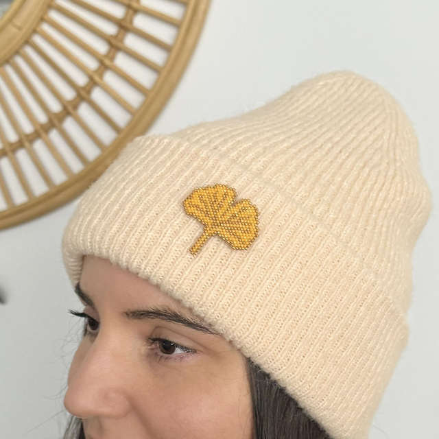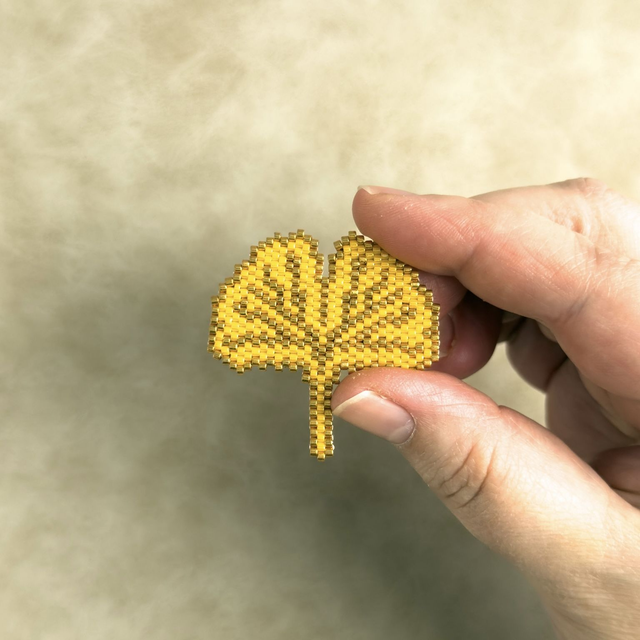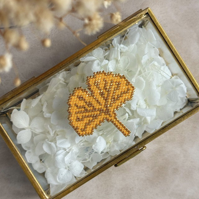 La feuille de ginkgo, symbole de longévité et de résilience. Tissée perle par perle dans des tons dorés chaleureux, cette broche s'inspire des formes organiques et apaisantes de la nature. Une pièce élégante et intemporelle qui traverse les saisons.
